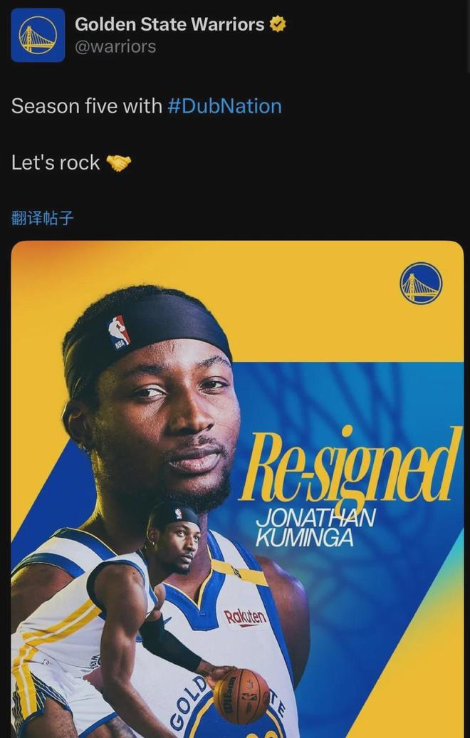 库明加两年4850万美元重新加盟勇士,该合同包含球队选项,并且放弃了交易否决权。